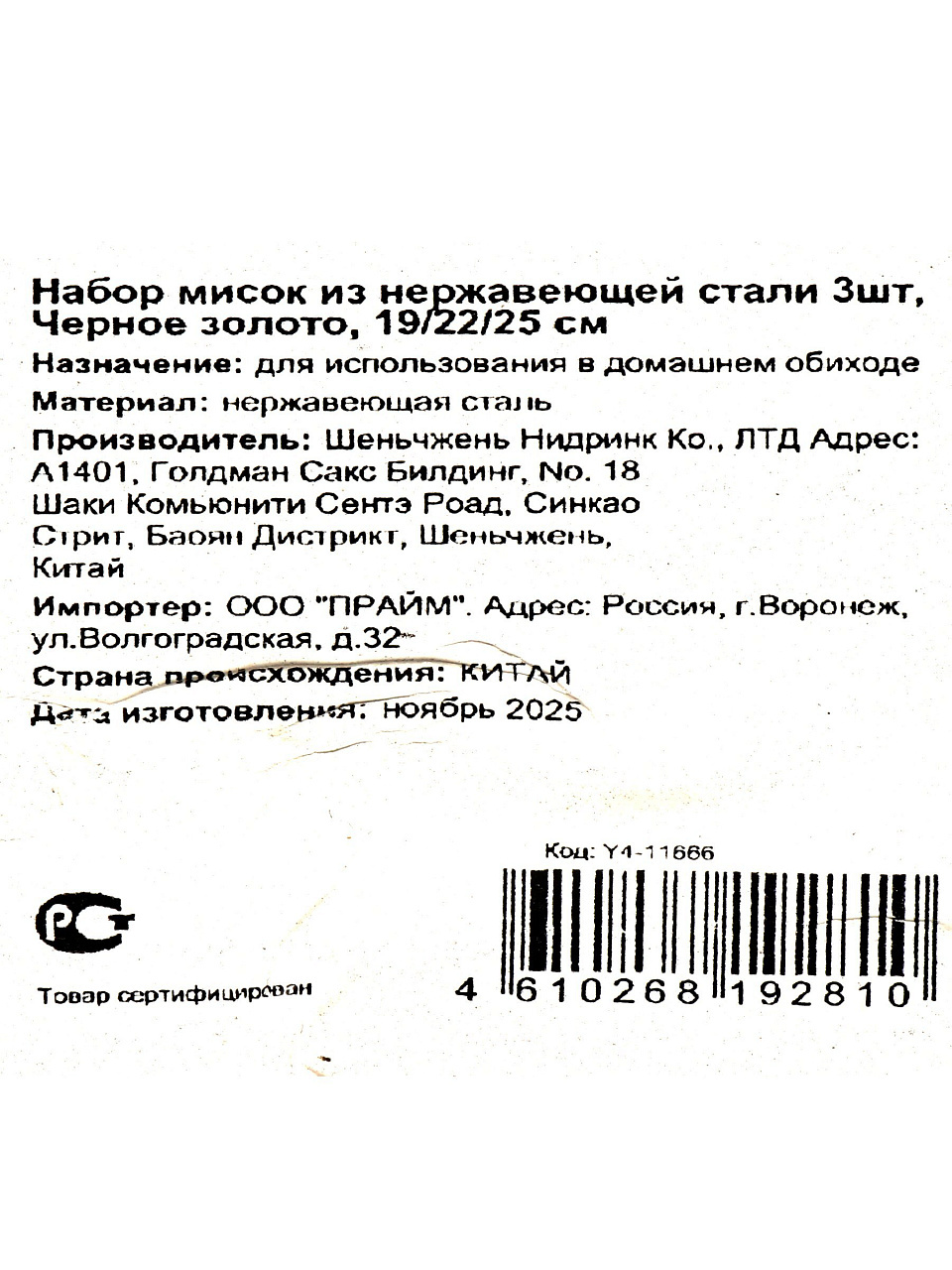 Вы можете приобрести «Набор мисок нержавеющая сталь, круглый, 3 шт, 19, 22, 25 см, Черное золото, Y4-11666» и другие товары в нашем интернет-магазине в Белгороде по низким ценам и с бесплатным самовывозом.