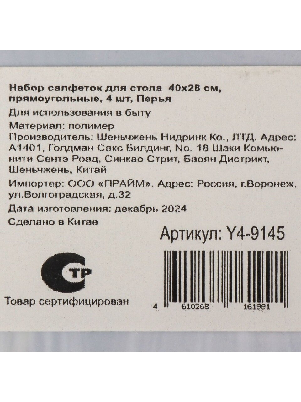 Вы можете приобрести «Набор салфеток пластик, 40х28 см, прямоугольный, 4 шт, для стола, Перья, Y4-9145» и другие товары в нашем интернет-магазине в Ярославле по низким ценам и с бесплатным самовывозом.