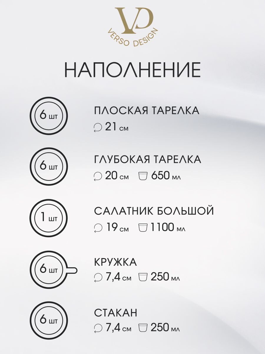 В наборе 25 предметов, рассчитанных на 6 персон — это оптимальное решение для семьи или небольшой компании.