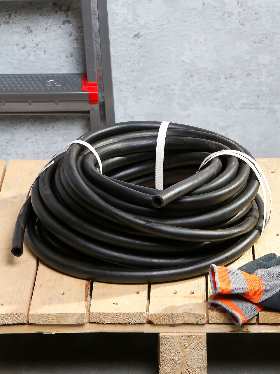 Длина изделия — 25 метров, материал — цельная резина с армирующей оплёткой, цвет — черный. Это обеспечивает долгий срок службы и устойчивость к внешним воздействиям.