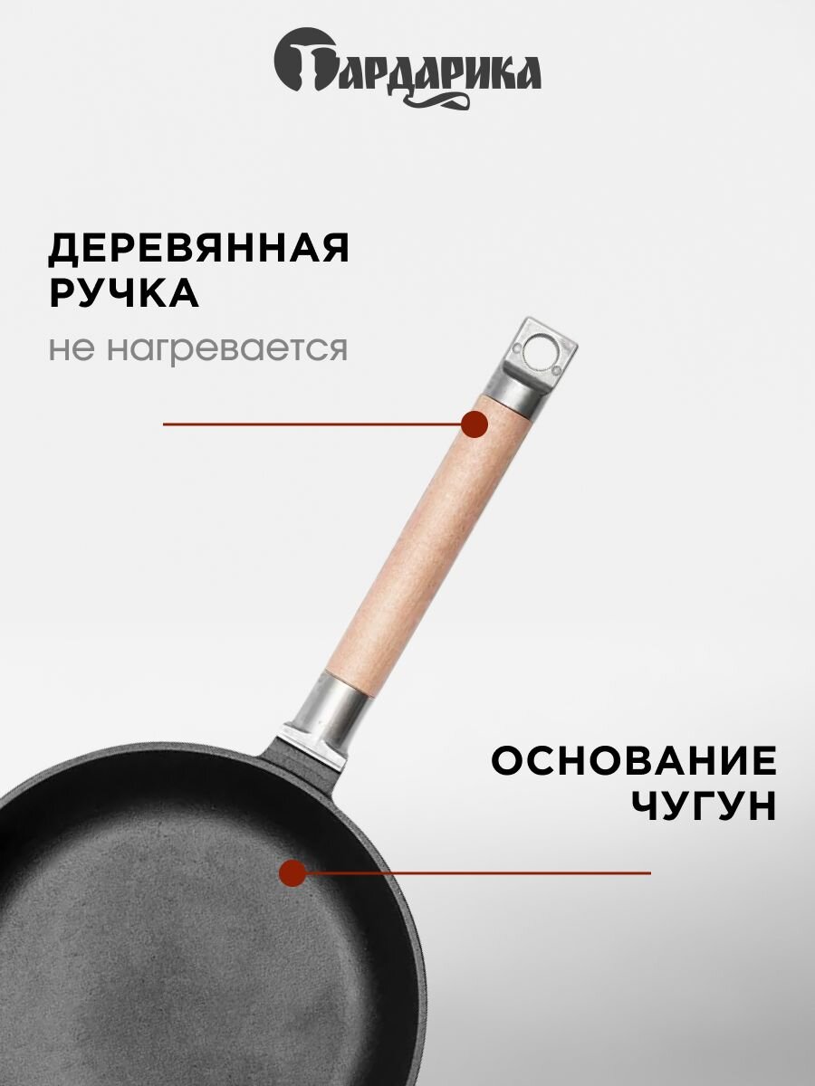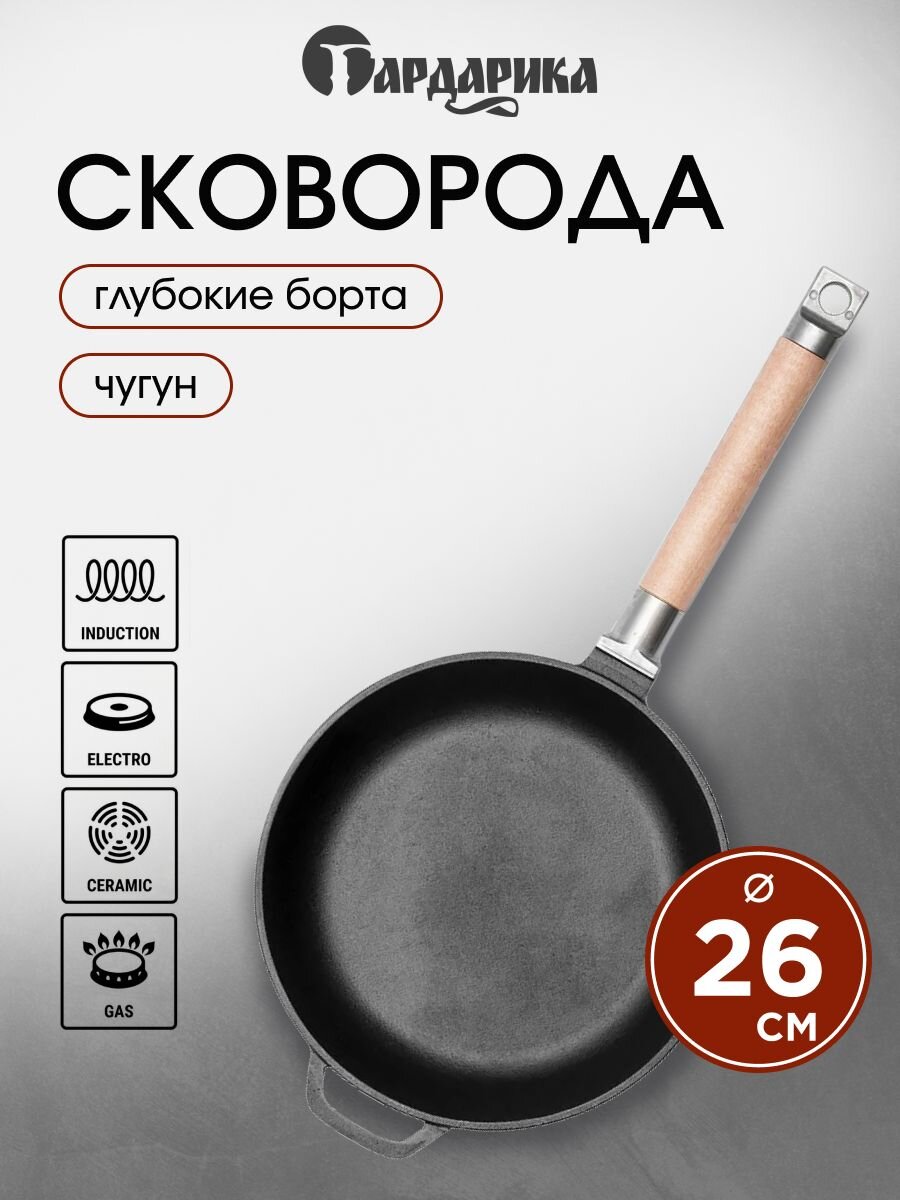 Чугунная сковорода Гардарика 26 см с высокой стенкой и съемной деревянной ручкой — идеальный выбор для жарки без ограничений: мясо, рыба, омлет. Совместима с индукцией.