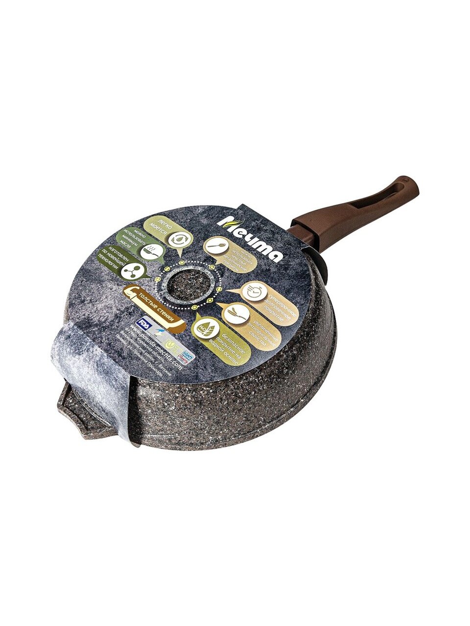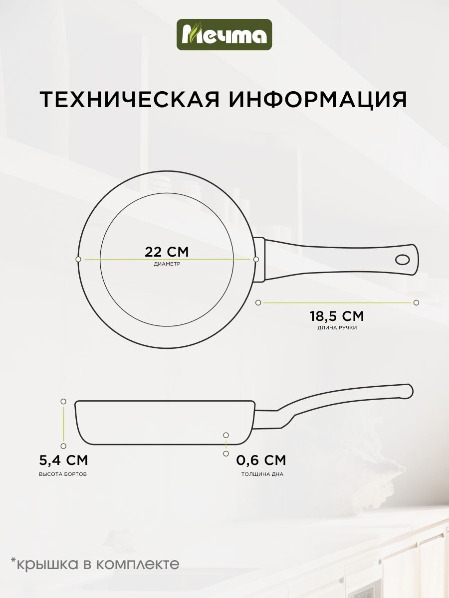 Изделия ТМ «Мечта» имеют полимеркерамическое покрытие. За счет этого еда не пригорает даже без масла. Кроме того, оно не выделяет токсические вещества при нагревании, так как не содержит перфторированной карбоновой кислоты.