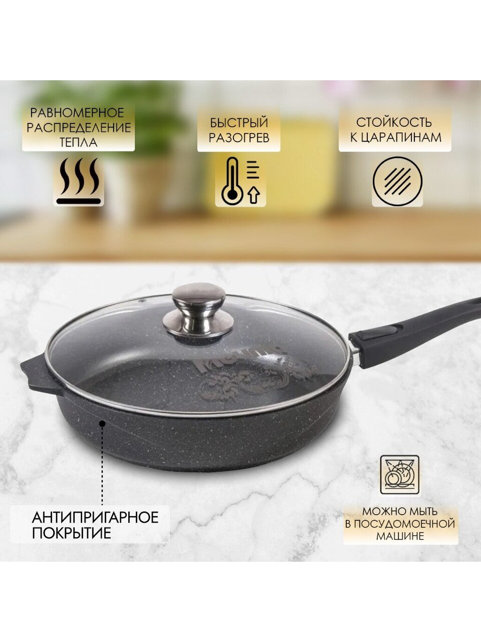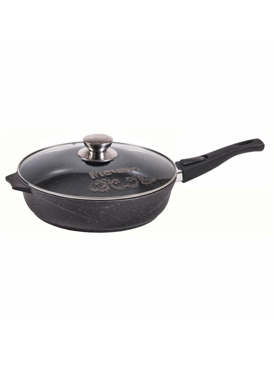Сковорода Мечта Гранит black 28 см: литой алюминий, антипригарное покрытие, крышка и съемная ручка — решение для вкусных и здоровых блюд без пригорания.