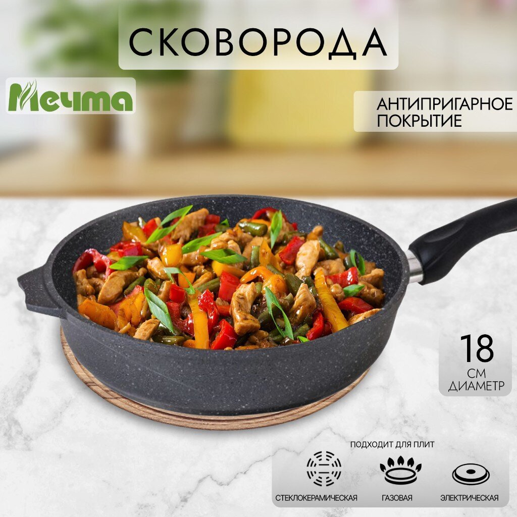 Сковорода из литого алюминия Мечта Гранит диаметром 18 см — это оптимальное решение для тех, кто ищет компактную, долговечную и удобную посуду для ежедневного использования. Благодаря гранитному антипригарному покрытию вы можете готовить блюда без масла, а пища не прилипает даже при минимальном уходе. Часто спрашивают: «Как выбрать сковороду для дачи?» — этот вариант идеально подходит для небольшой семьи или готовки завтраков, омлетов, оладий, рыбы и мяса. Толстое дно (6 мм) и стенки (4 мм) способствуют равномерному прогреву, предотвращая пригорание и сохраняя сочность продуктов.