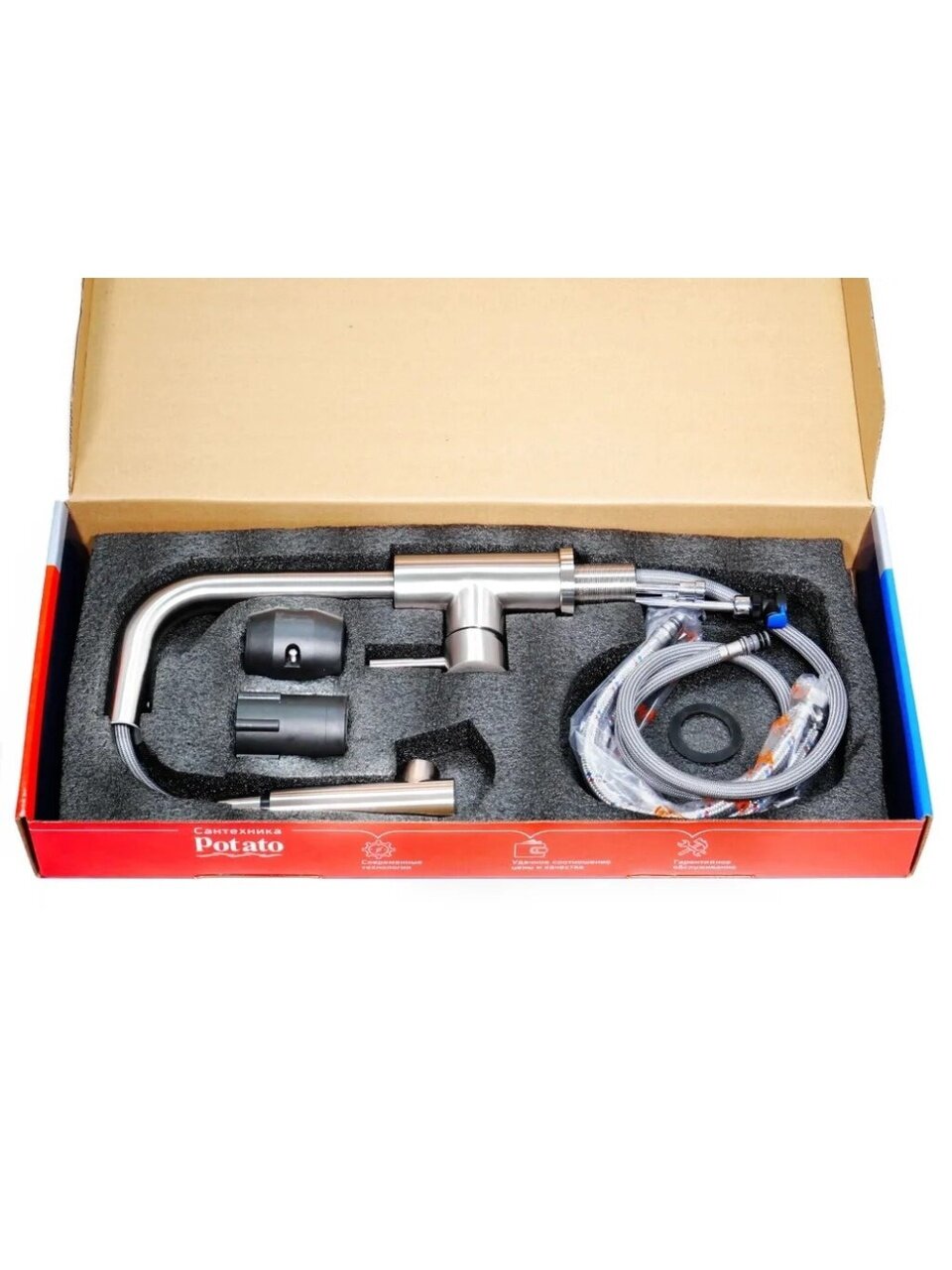 Смеситель для кухни Potato P0047S — выдвижной излив 20 см, нержавеющая сталь, современный дизайн, лёгкая установка. Решение для практичной кухни.