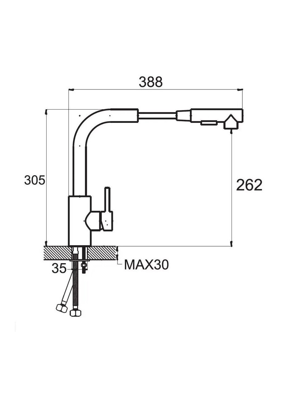 Смеситель устанавливается горизонтально в одно монтажное отверстие диаметром 35 мм. Длина выдвижного излива — 20 см, стандарт подводки — 1/2".