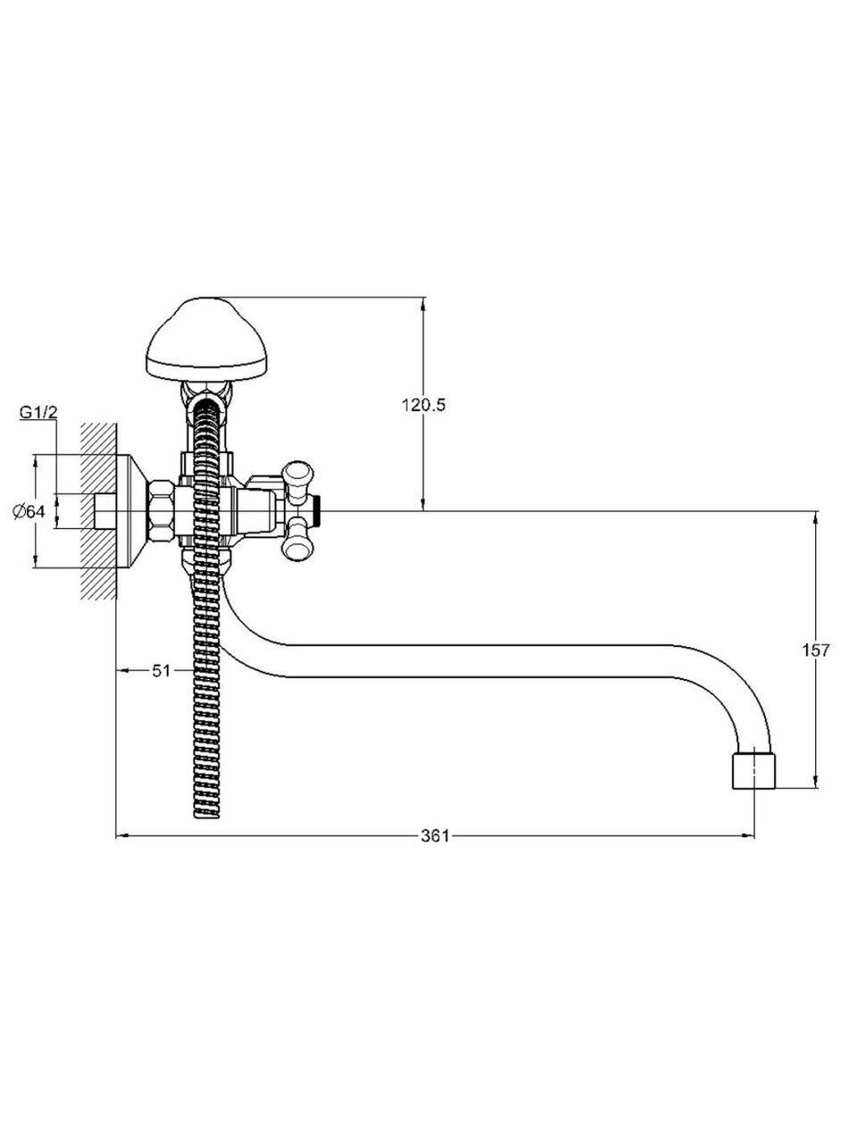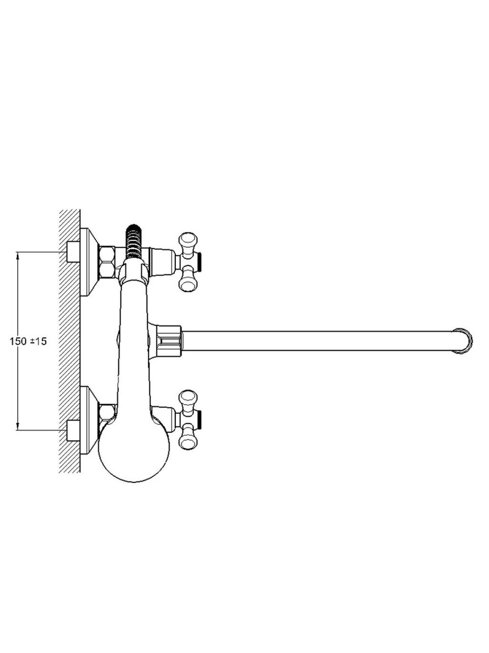Межосевое расстояние — 150 мм, длина излива — 31 см, монтаж вертикальный настенный на 2 отверстия, стандарт подводки — 1/2". В комплекте есть лейка и жёсткая подводка.