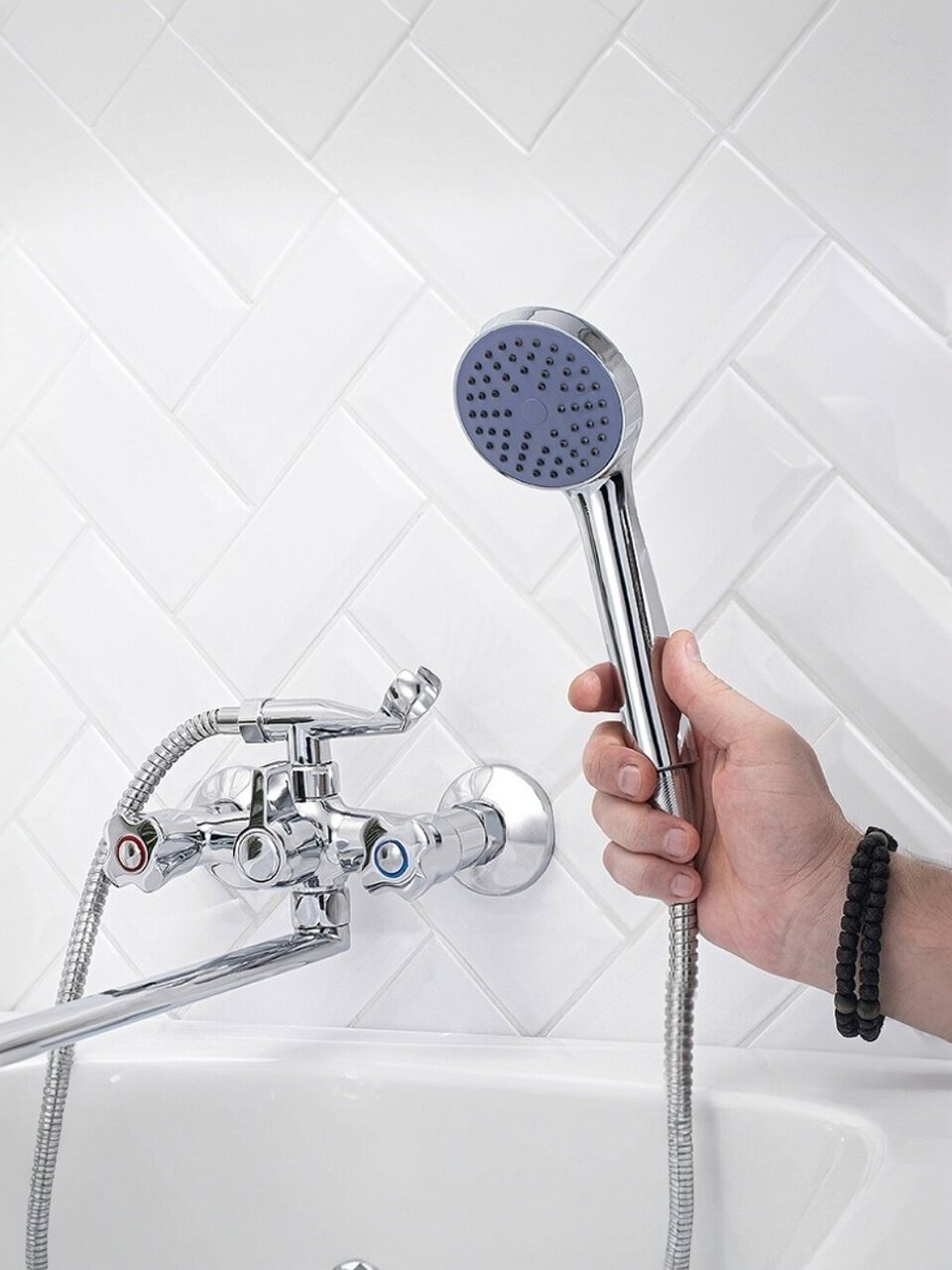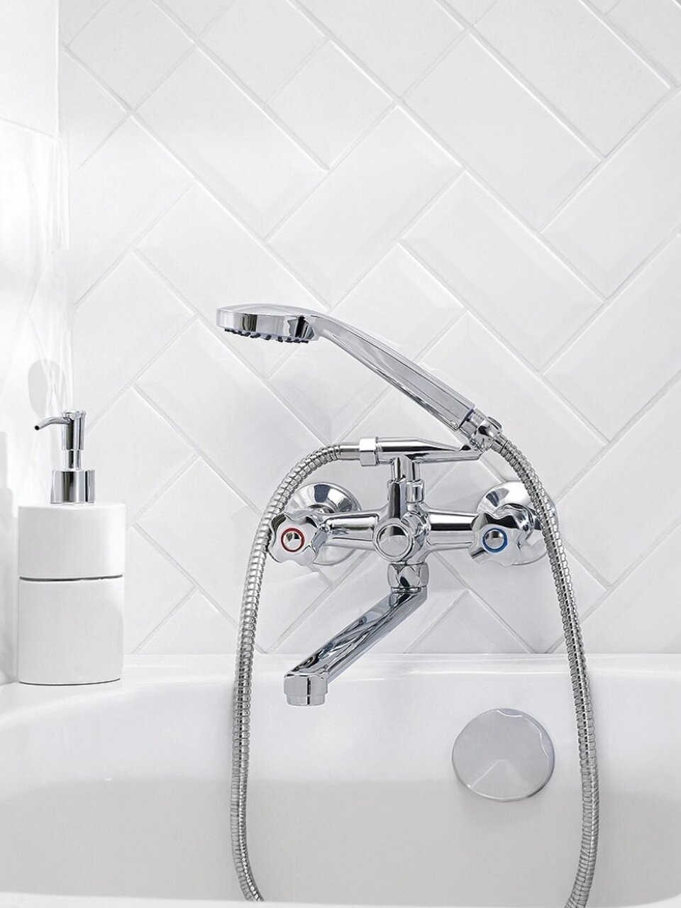 Если вы ищете, какой смеситель выбрать для ванной с душем, обратите внимание на комплектацию этой модели: в наборе есть лейка, а жесткая подводка и аэратор с защитой от излома делают эксплуатацию максимально удобной. В отличие от пластиковых аналогов, корпус из цинкового сплава устойчив к механическим повреждениям и не подвержен коррозии. Смеситель легко устанавливается на 2 монтажных отверстия с межосевым расстоянием 150 мм, стандарт подводки — 1/2 дюйма. Подходит для вертикального настенного монтажа в современных ванных комнатах.