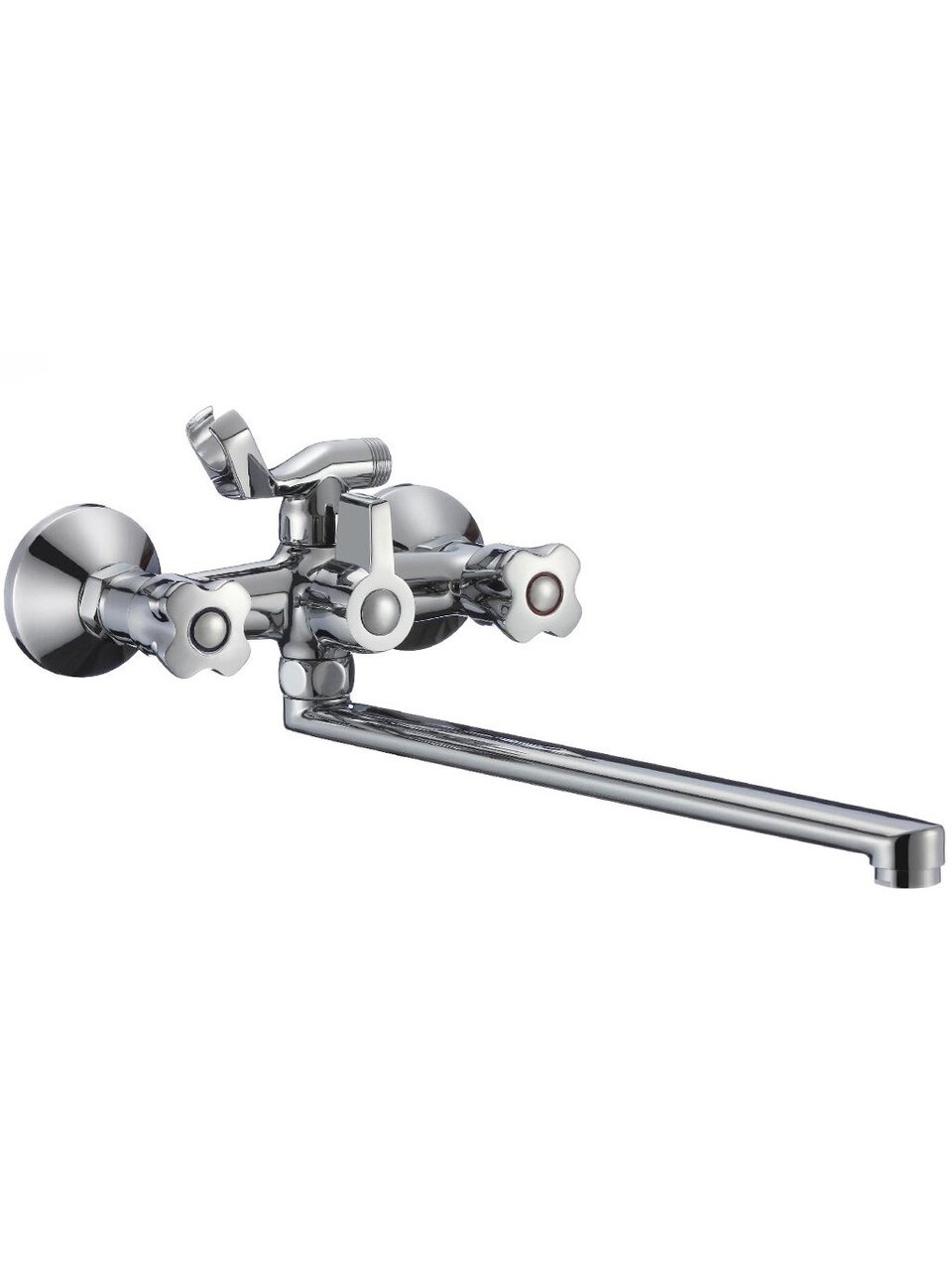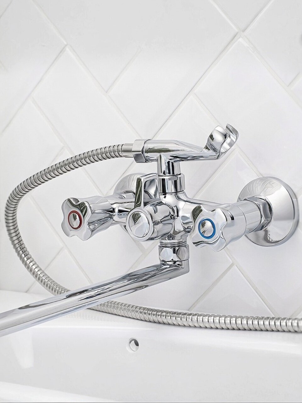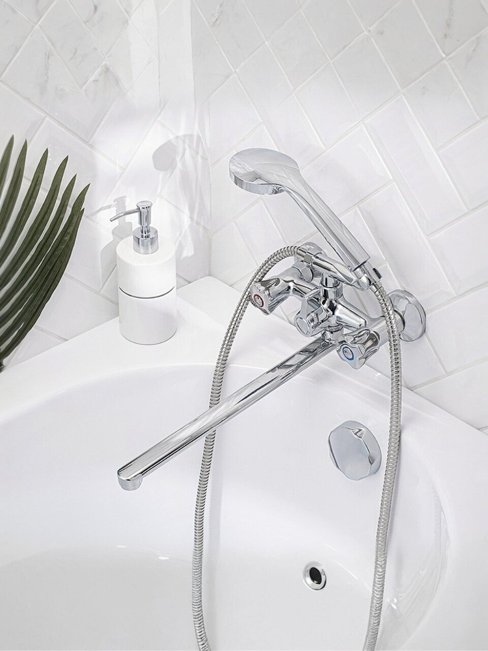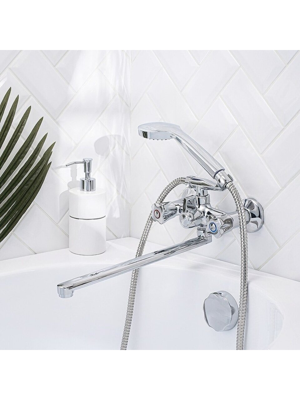 - Длинный излив 35 см, цинковый сплав корпуса — устойчив к коррозии, подходит для стандартных ванн