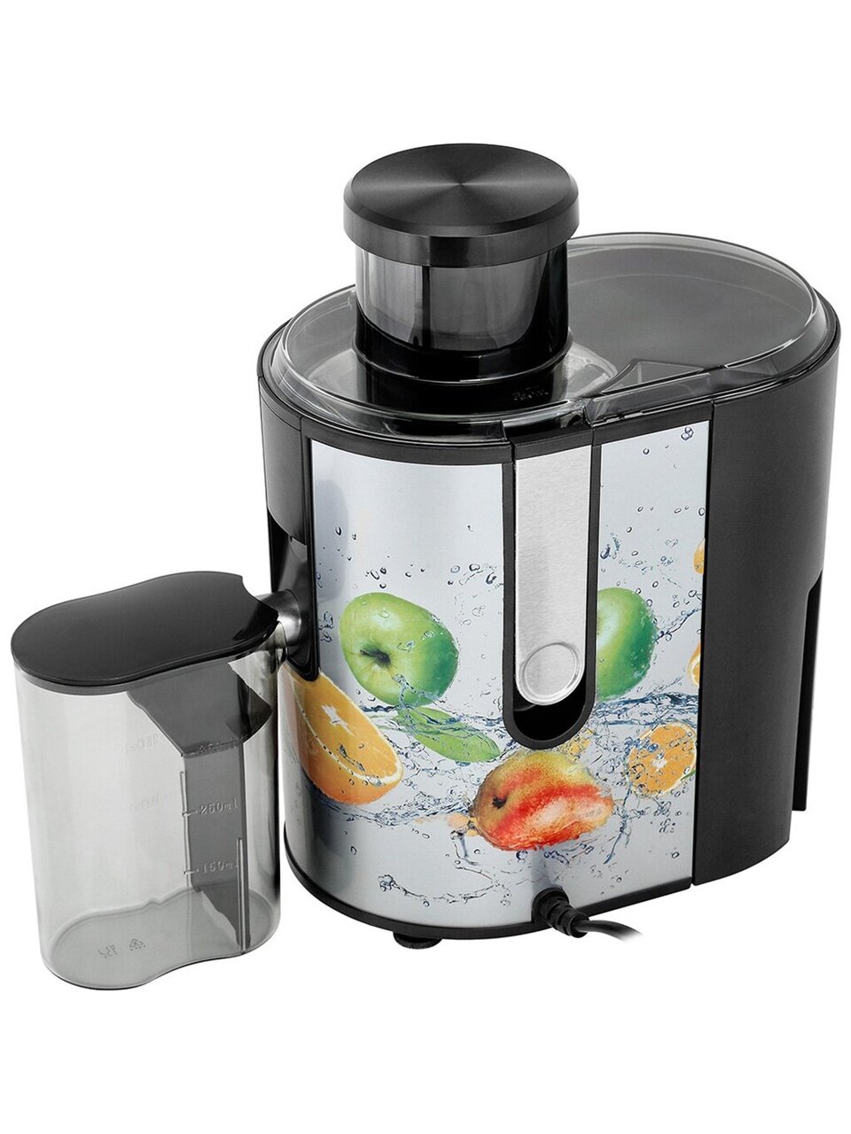 Антикапельная система сохранит поверхности кухни чистой при опорожнении ёмкости прибора. Соковыжималка не включится, если крышка закрыта неплотно — это предотвращает получение серьёзных порезов. А прочные прорезиненные ножки надёжно фиксируют прибор на столе. Дизайнерская соковыжималка выполнена в стальном корпусе с яркими принтами, которые поднимут настроение.