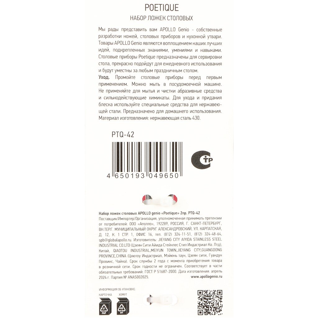 Вы можете приобрести «Ложка нержавеющая сталь, 2 предмета, столовая, Apollo, genio Poetique, PTQ-42» и другие товары в нашем интернет-магазине в Иваново по низким ценам и с бесплатным самовывозом.