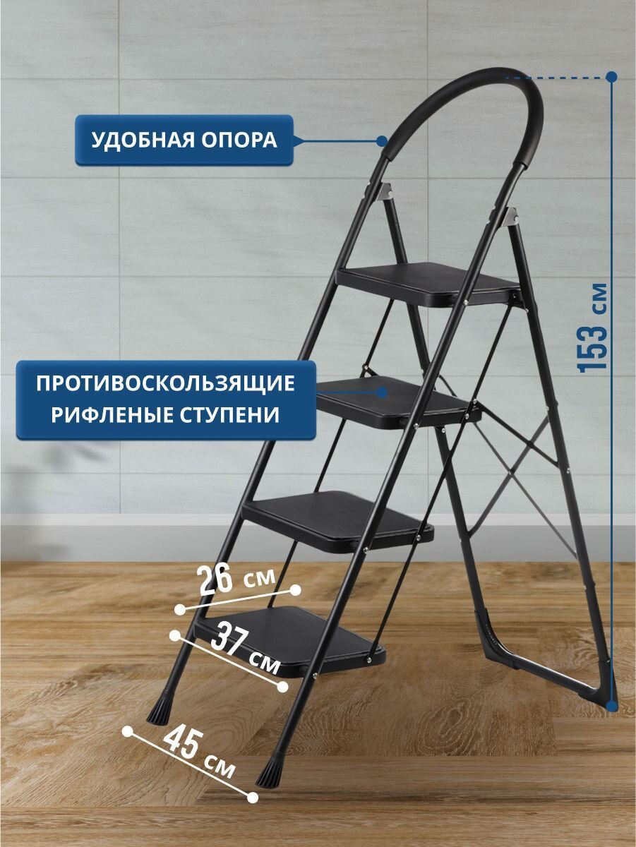 Стремянка изготовлена из высококачественных материалов, что обеспечивает ее долговечность и устойчивость.