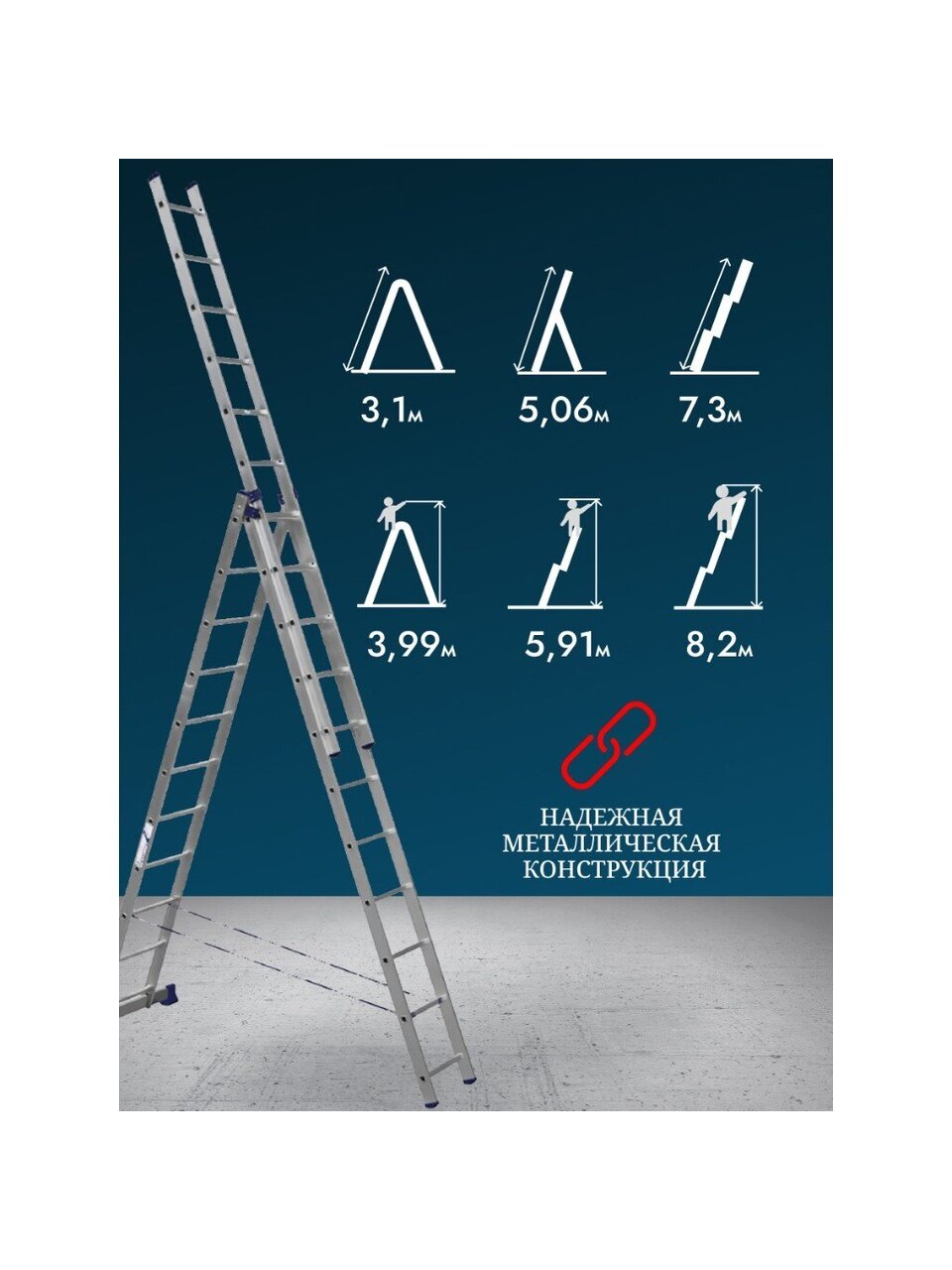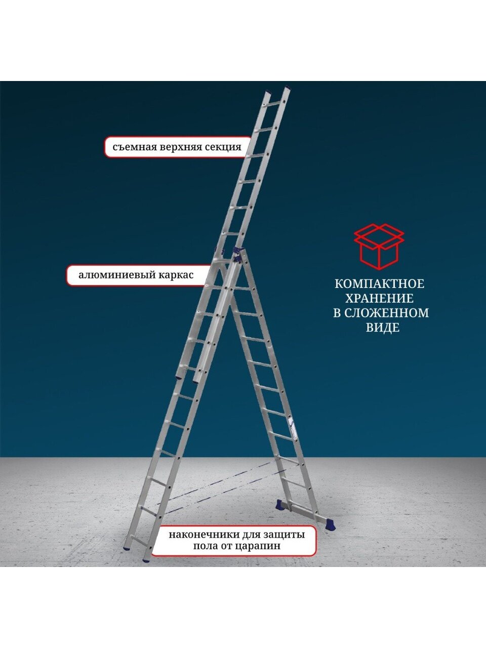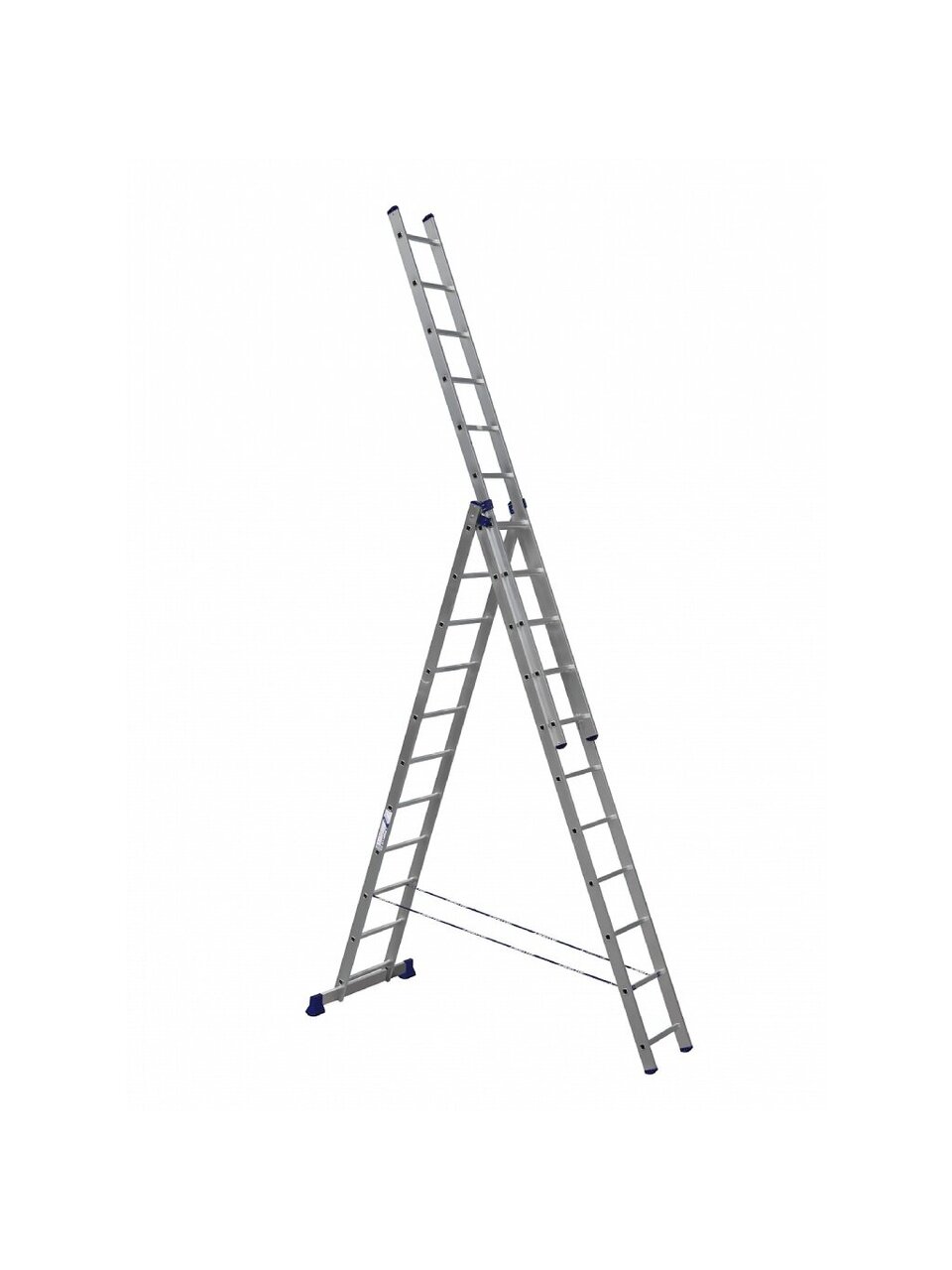 Лестница трехсекционная — это универсальная алюминиевая лестница, которая сочетает в себе сразу функции приставной лестницы, лестницы-стремянки и двухсекционной лестницы. Трехсекционная алюминиевая лестница собрала в себе все преимущества односекционной и двухсекционной лестницы. Данная лестница универсальна, состоит из трех частей и может использоваться в широком диапазоне высот. Имеется возможность использовать верхнюю секцию как отдельную небольшую приставную лестницу.