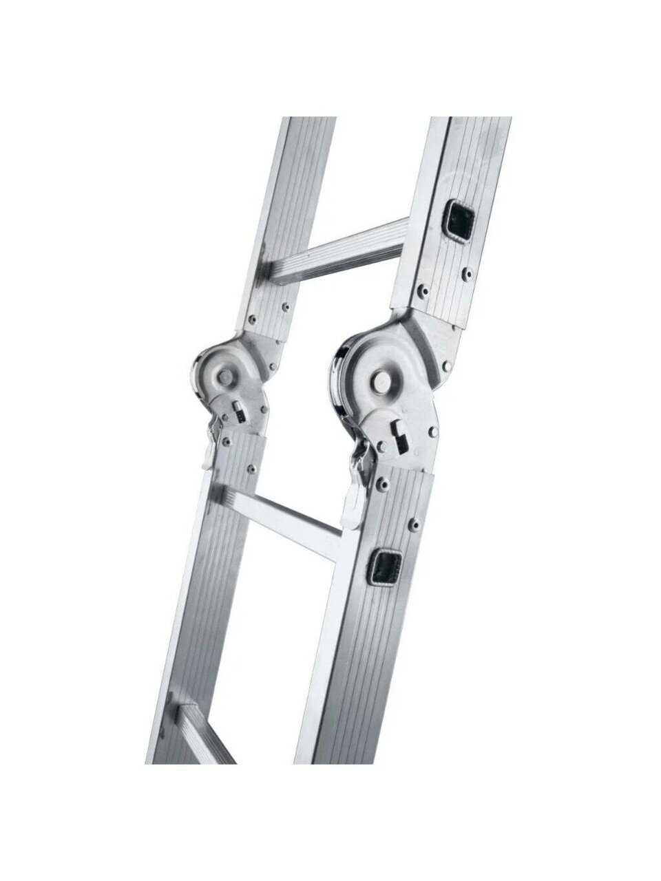 Универсальность данной лестницы заключается в том, что она может использоваться как раздвижная приставная лестница из трех частей и как свободностоящая стремянка (перевернутая русская буква «У»). Более того третья секция является съемной, и ею можно пользоваться отдельно как приставной лестницей, а оставшаяся часть при этом представляет двухсекционную универсальную лестницу. Эта лестница является по праву наиболее универсальной из всех лестниц.