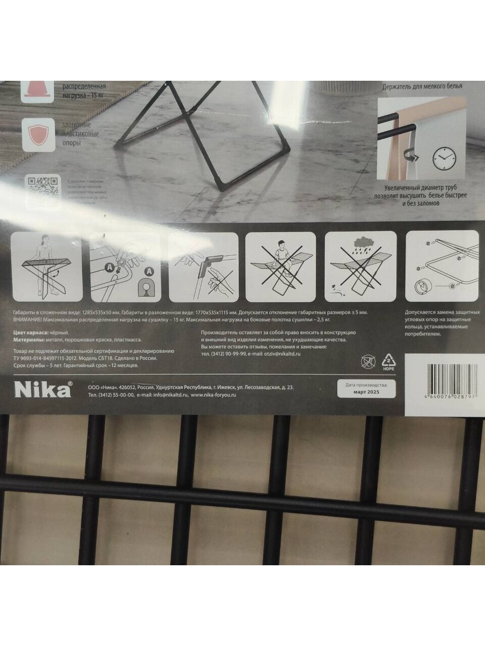 Вы можете приобрести «Сушилка для белья напольная, полотно 18 м, 177х53.5х111.5 см, складная, 18 прутьев, 15 кг, черная, Nika, СБТ18/Ч» и другие товары в нашем интернет-магазине в Казани по низким ценам и с бесплатным самовывозом.