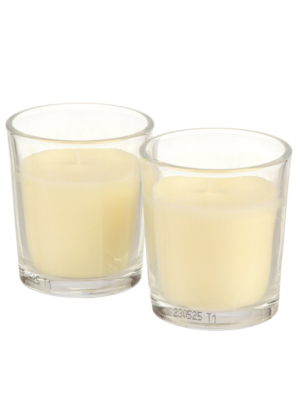 В наборе две свечи, каждая в стеклянном стакане размером 6,6×5,8 см. Свечи изготовлены из безопасного воска, не выделяющего вредных веществ при сгорании.