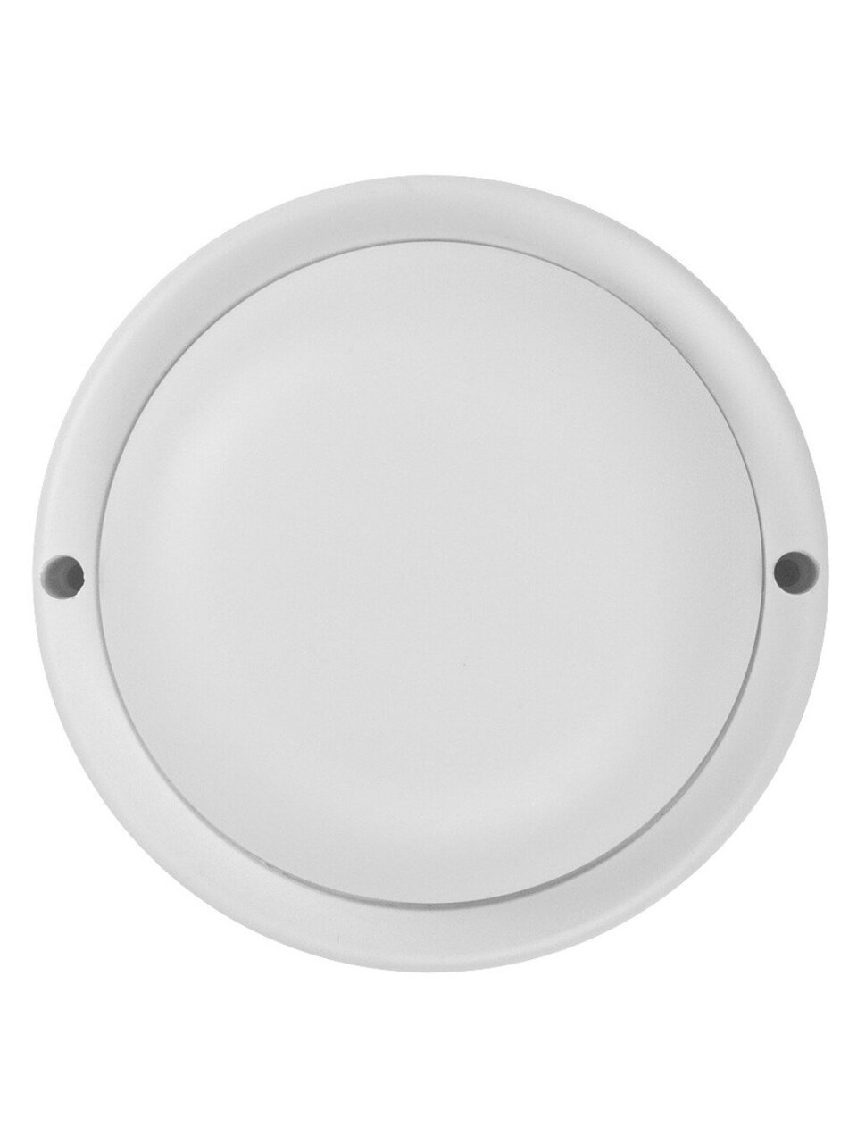Светильник предназначен для настенного и потолочного монтажа в подъездах, на даче, в гараже, мастерских и производственных помещениях. Размер — 13,8×13,8×4,6 см, форма круглая, цвет белый.