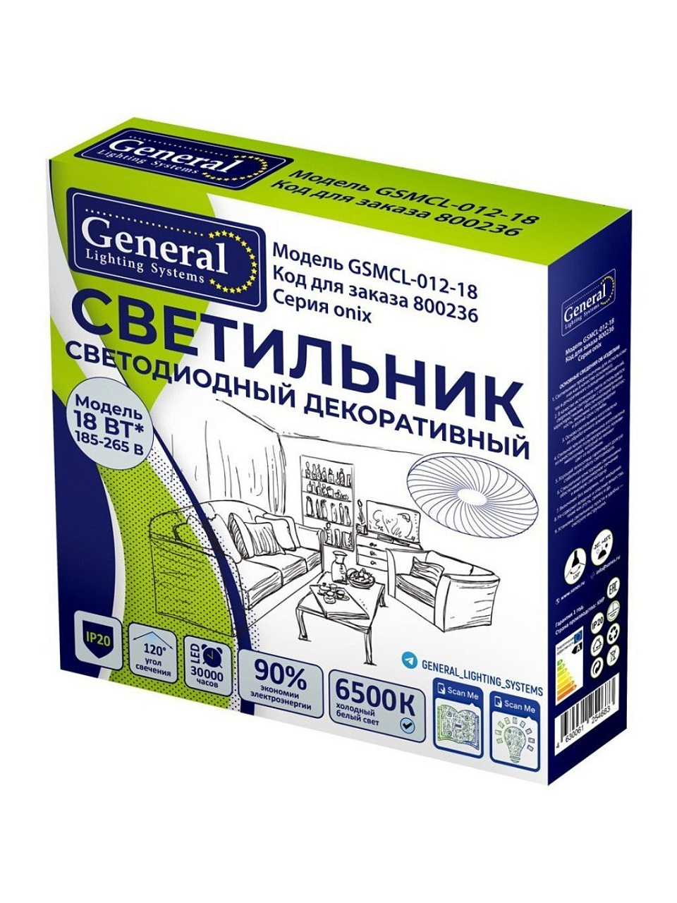 Светодиодный потолочный светильник General 18 Вт: экономия энергии, холодный белый свет 6500К, срок службы 30 000 ч. Идеальное решение для современного интерьера.