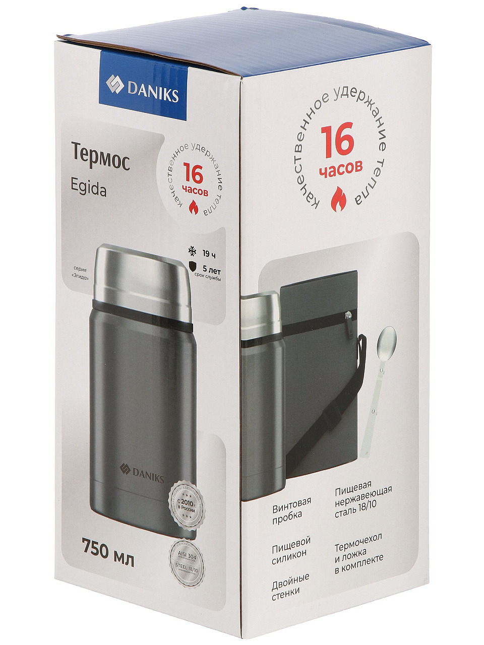 Вы можете приобрести «Термос для еды, нержавеющая сталь, 0.75 л, широкая горловина, Daniks, Эгида, колба нержавеющая сталь, с ложкой, с чехлом, серый, DTS-750» и другие товары в нашем интернет-магазине в Ярославле по низким ценам и с бесплатным самовывозом.