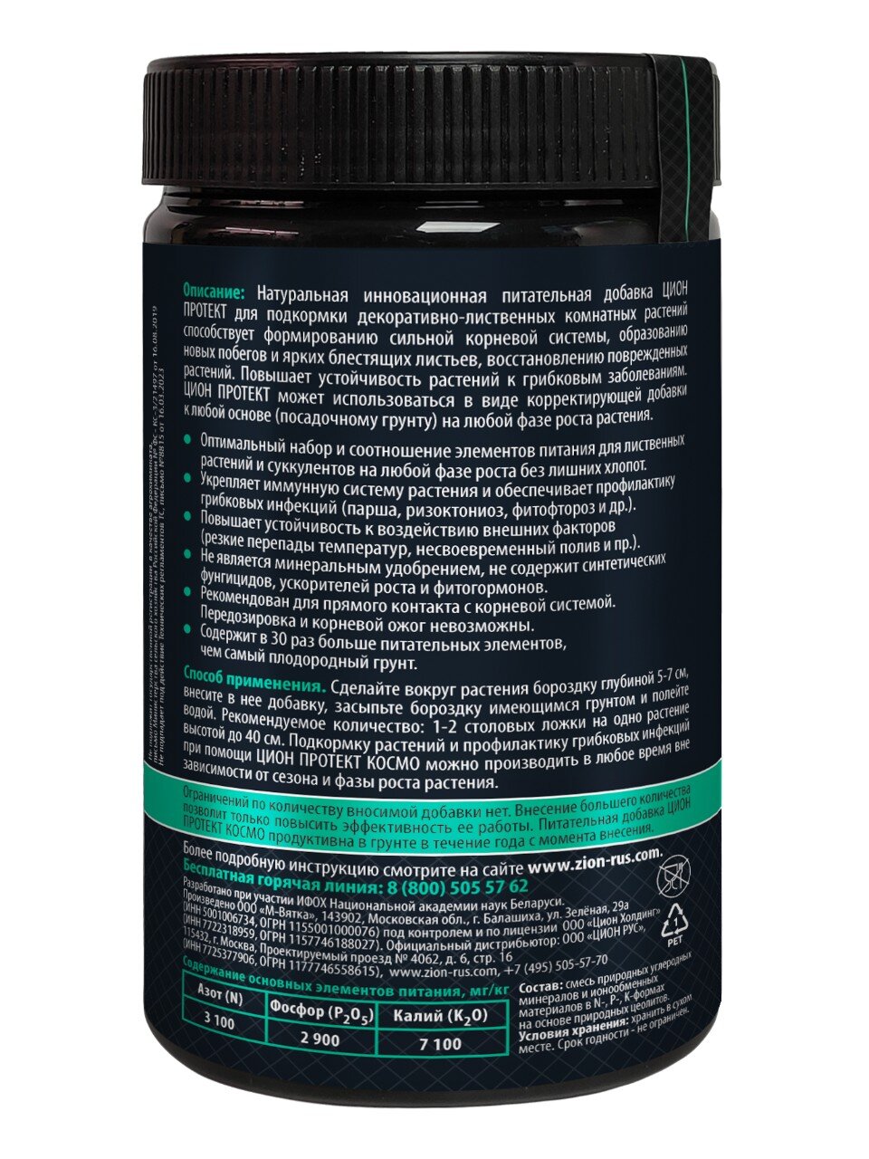 ЦИОН Космо содержит в качестве носителя небольшой процент органической полимерной матрицы, в отличие от остальных продуктов ЦИОН, где в качестве носителя элементов питания растений используются природные минералы (цеолиты). Органический полимерный носитель позволяет дозировать и доносить до корней растений азот в нитратной форме. Таким образом, декоративно лиственные комнатные растения гармонично развиваются в помещении, увеличивая размер и количество листьев и приобретая яркий, насыщенный цвет.