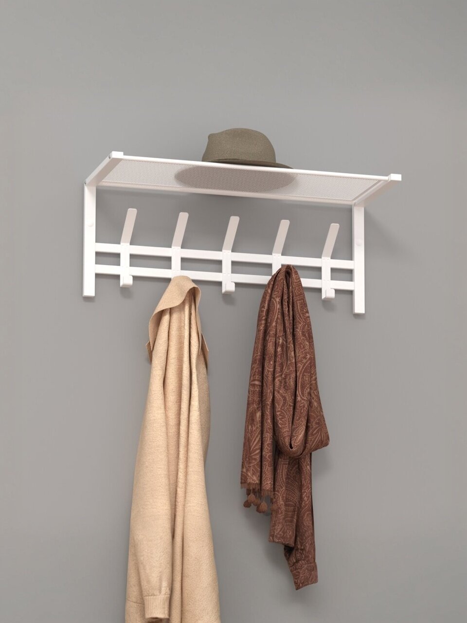 - На вешалке есть полка, которая позволяет хранить аксессуары, такие как шарфы, перчатки и другие мелочи.