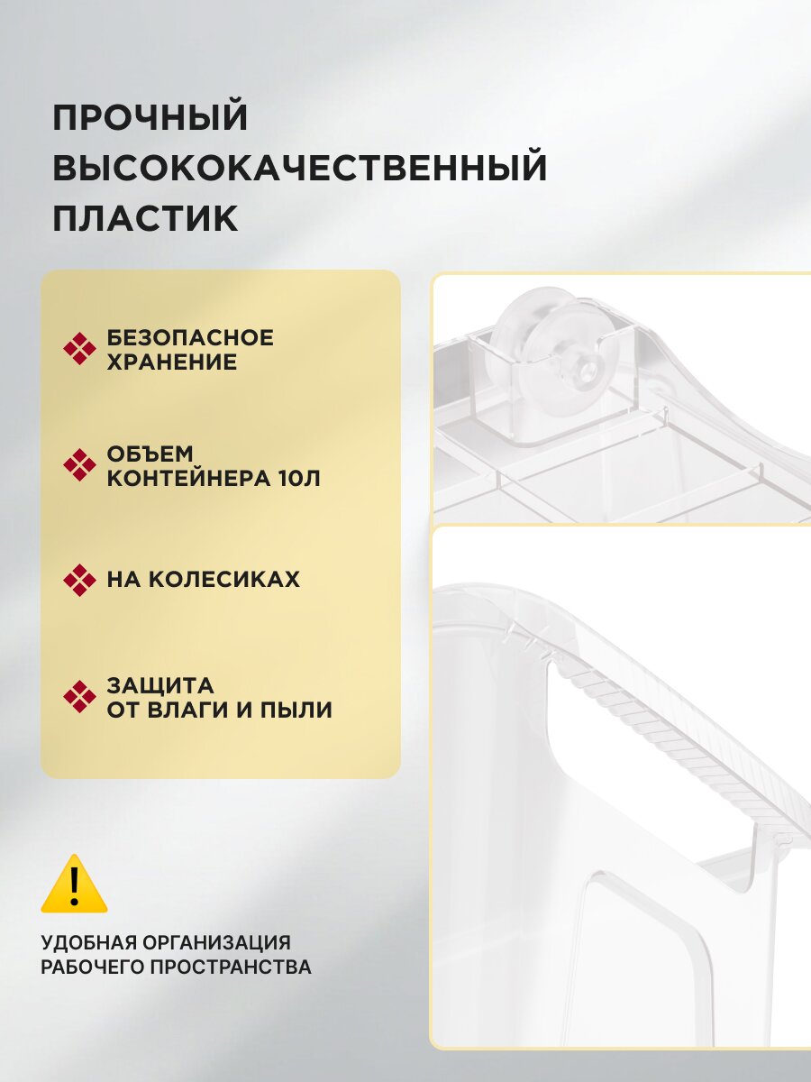 Контейнер хозяйственный 10 л на колесиках — это выгодная покупка для дома, дачи или офиса. Закажите сейчас и оцените удобство организации пространства с гарантией качества от производителя.