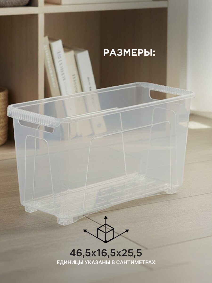 Контейнер имеет габариты 46.5×16.5×25.5 см, объем 10 литров. Подходит для хранения мелких вещей, детского или гостевого постельного белья, одежды, игрушек.