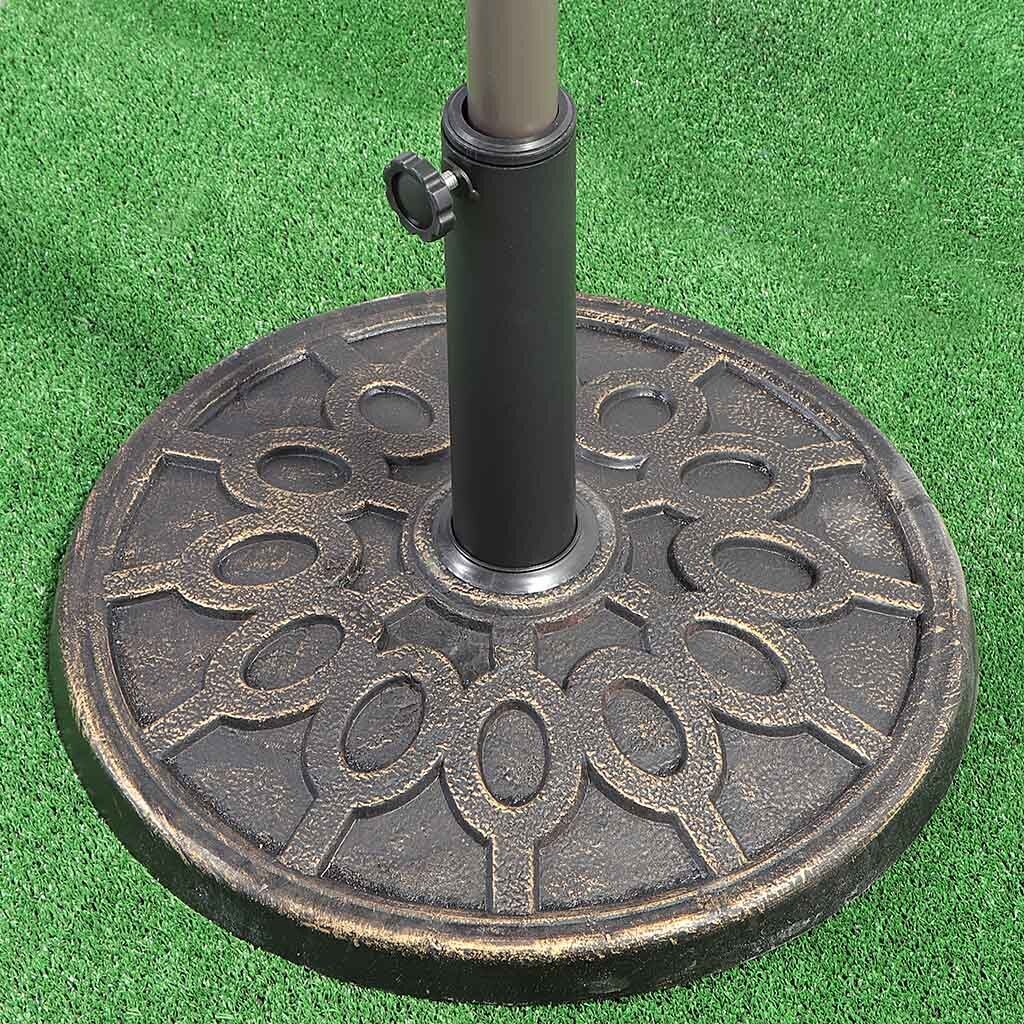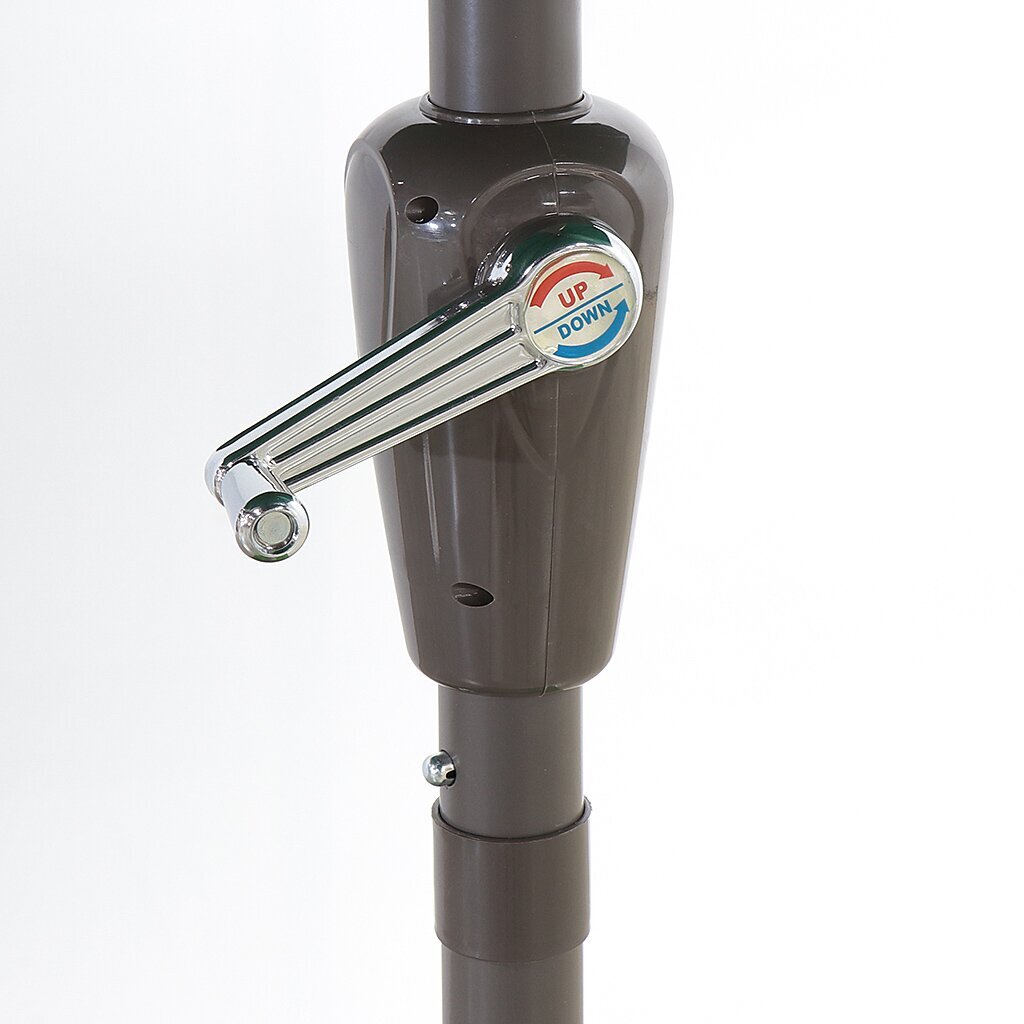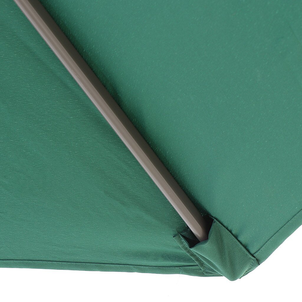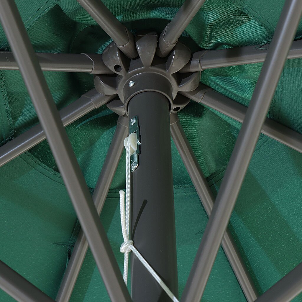 Сам тент диаметром 2,7 м выполнен из полиэстера. За счет спицевой конструкции купол разделен на 8 сегментов. Зонт имеет простой механизм управления. Складывается до компактных размеров, удобных для хранения и транспортировки.